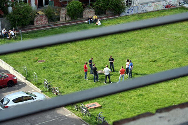 Diese Gruppe trifft sich jeden Nachmittag zur Kreis-Diskussion auf dem Rasen unter meinem Fenster. Wer die wohl sind? Nur bei Regen scheinen sie nicht zu kommen.
