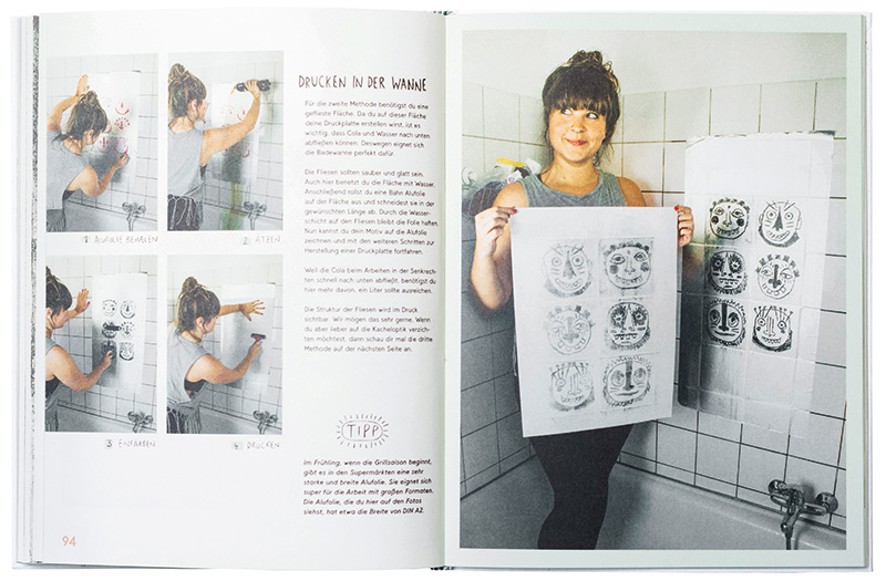 Das Buch, das Laura und Lucas über Kitchen Litho geschrieben haben ist nicht nur sehr schön gestaltet. Es werden viele unterschiedliche Anregungen gegeben auf was man drucken kann – Papier ist ja nur eine Möglichkeit: auch Luftballons, Stoff oder Holz kann man bedrucken. Für größere Formate kann man in die Badewanne gehen oder die Fensterscheibe benutzen.